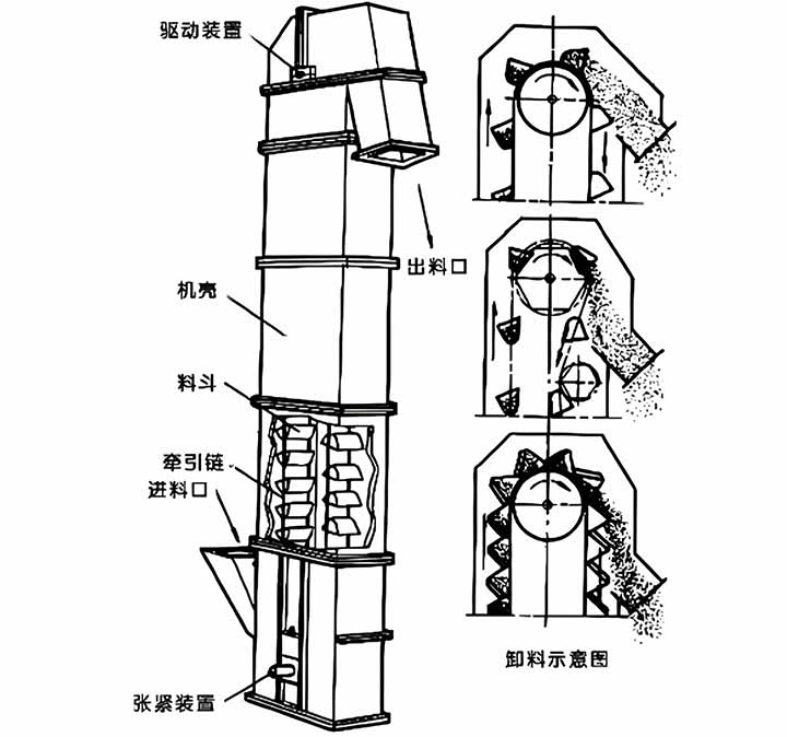 斗式提升机在尾部卸载物料。卸载的形式有三种,即离心式、离心-重力式及重力式。