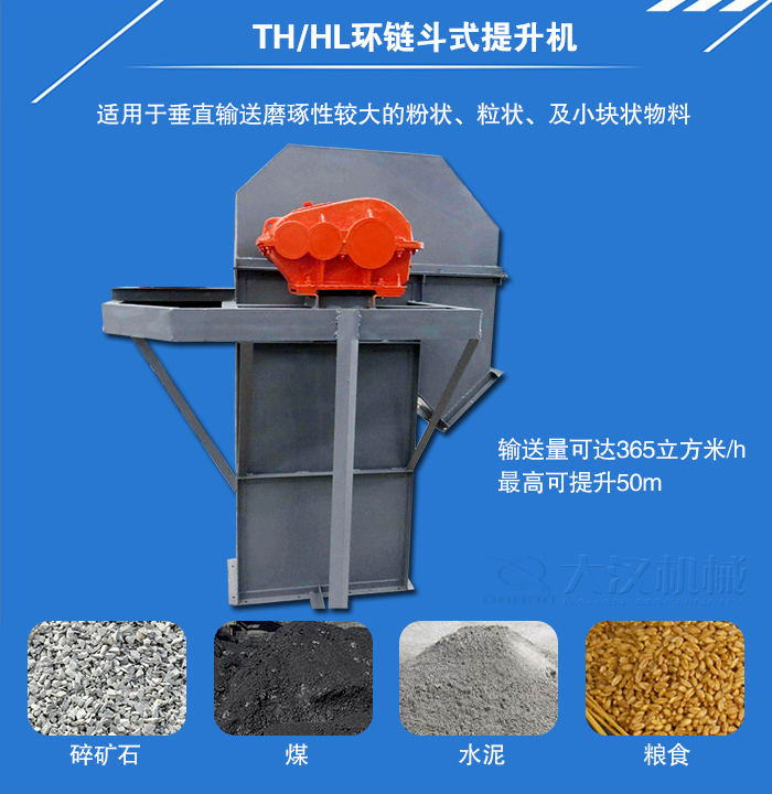 TH/HL环链斗式提升机牵引机构是两根环形链条,为混合或重力方式卸料,掏取式装料,输送量可达365m³/h,高可提升50m。