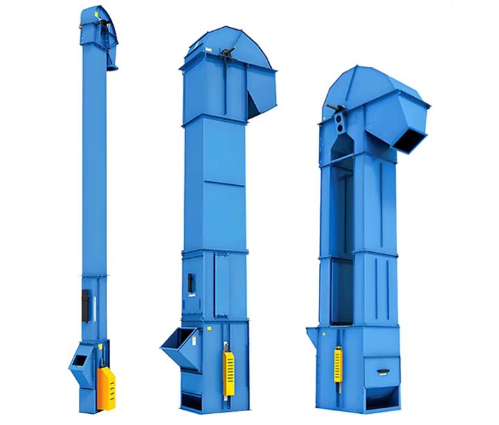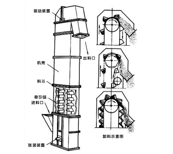 工业废料斗式提升机由驱动装置、上部滚筒、下部张紧装置、环形链条及料斗组成。电机带动减速机运转,进而驱动上部滚筒转动,拉动环形链条跟着动起来。废料从下部进料口流入,被运动中的料斗挖取并装进去。随后,料斗随着链条往上走,绕到顶部滚筒的时候就会翻转,靠离心力或者自身重力,把里面的废料从卸料口倒出去。