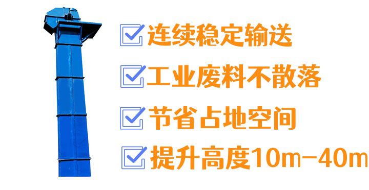 工业废料斗式提升机的垂直提升高度在5米至50米左右,处理量根据机型大小一般在5至500立方米/小时之间。进出料方式为下部是掏取式或流入式进料,上部为离心式或重力式出料。设备的部件如料斗常用耐磨钢,对于腐蚀性的环境可用不锈钢或表面防腐处理,牵引件多选用高强度橡胶带或耐磨锰钢链条,而机壳及头尾轮轴等部件则采用碳钢并进行防腐处理或直接使用不锈钢材质。