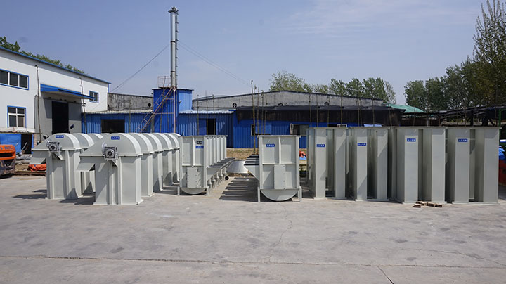经过斗提机机械技术人员长期分析研究,对近两年来每次堵料的情况和原因进行分析,由于大块异物进入管道造成堵塞的通过加装振动筛已经处理;由于胶带打滑,减少了提升机的提升量,使机座内物料增多形成堵塞,我们通过增大张紧力,防止胶带打滑的产生,但是90%以上堵灰的情况都是由于输灰系统斗提刮板连接管处出现堵灰,由于当时设计不合理引起的。目前输灰系统斗式提升机刮板连接管易堵灰的问题,大汉机械找到比较好的两种解决方法是: