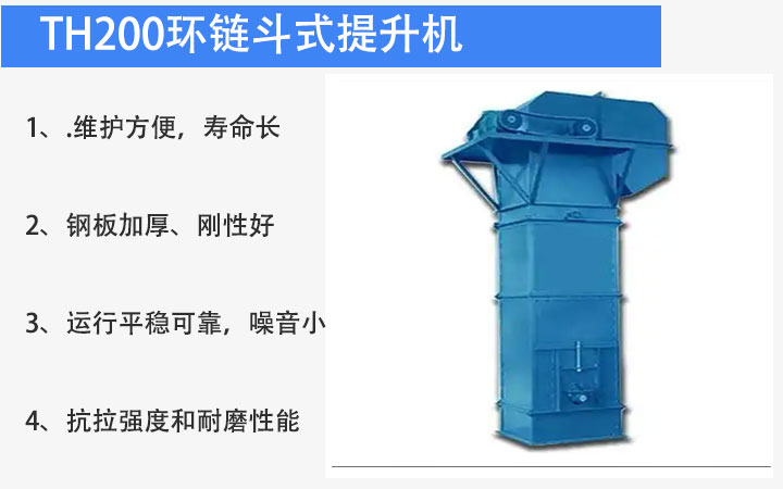 TH200环链斗式提升机适用于输送粉状、粒状及小块状的无磨琢及磨琢性小的物料。TH型是一种圆环链斗式提升机采用混合式或重力卸料,挖取式装料。牵引件用优质合金钢高度圆环链。中部机壳分单、双通道两种形式为机内重锤箱恒力自动张紧。链轮采用可换轮缘组合式结构。使用寿命长,轮缘更换工作简便。下部采用重力自动张紧装置,能保持恒定的张紧力,避免打滑或脱链,同时料斗遇到偶然因素引起的卡壳现象时有一定的容让性,能够有效地保护下部轴等部件。