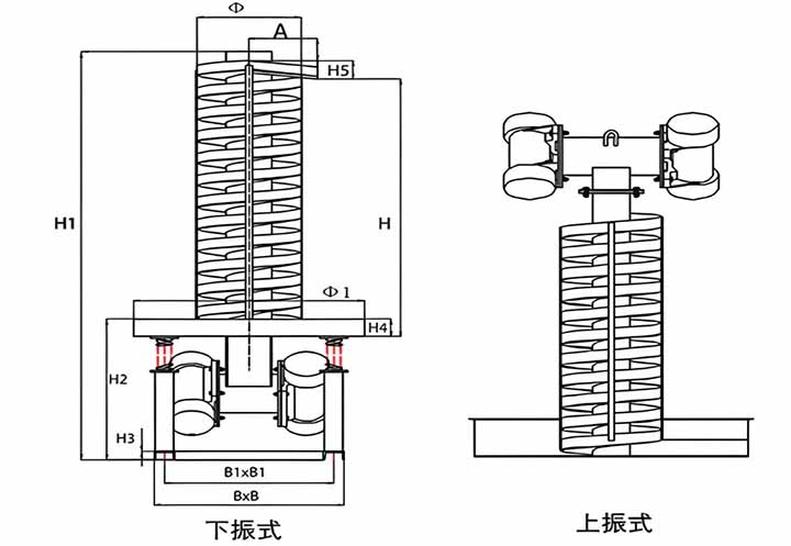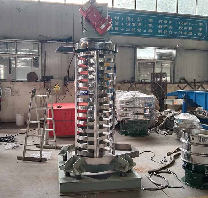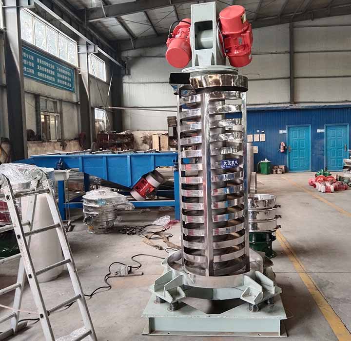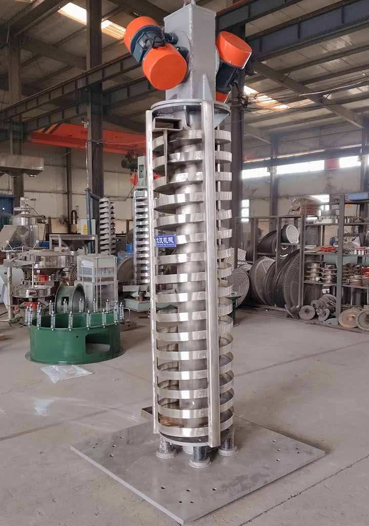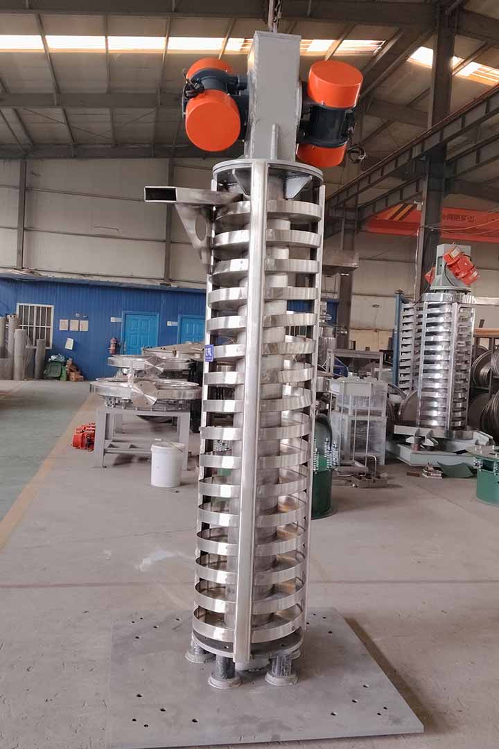 螺旋垂直振动提升机DZC系列垂直振动输送机的驱动装置振动电机安装在输送塔下部,两台振动电机对称交叉安装,输送塔由管体和焊接在管体周围的螺旋输送槽组成,输送塔座于减振装置上,减振装置由底座和隔振弹簧组成。当垂直输送机工作时,根据双振动电机自同步原理,由振动电机产生激振力,强迫整个输送塔体作水平圆运动和向上垂直运动的空间复合振动,螺旋槽内的物料则受输送槽的作用,作匀速抛掷圆运动,沿输送槽体向上运动,从而完成物料的向上(或向下)输送作业。